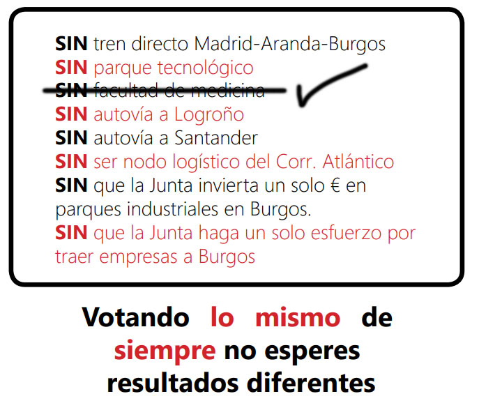 Sabemos que no estamos exentos de que algunos intenten aprovecharse de nuestro proyecto. Sabemos que los juegos sucios de la vieja política seguirán ahí. Pero os damos una garantía y es la de que seremos absolutamente transparentes. Todo lo que ocurra lo sabréis. Vuestra voz siempre será escuchada y vuestra opinión podrá marcar el rumbo. Porque esto, precisamente, va de devolveros el poder. No va de izquierdas, ni de derechas, ni de centros. No va de falsas promesas que luego ni siquiera intentan cumplir, como nos hacen a los burgaleses con el tren directo y la A12. Va de algo mucho más sencillo y mucho más grande: